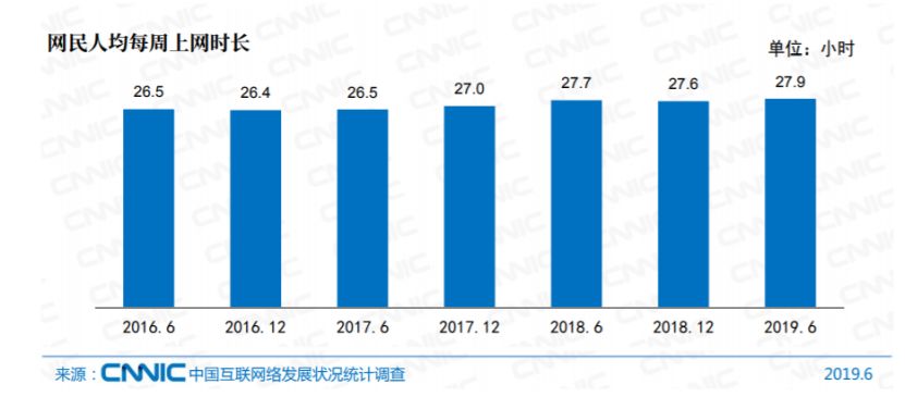 2019年上半年,中国网民的人均每周上网时长为27.9小时,较2018年底增加0.3小时。