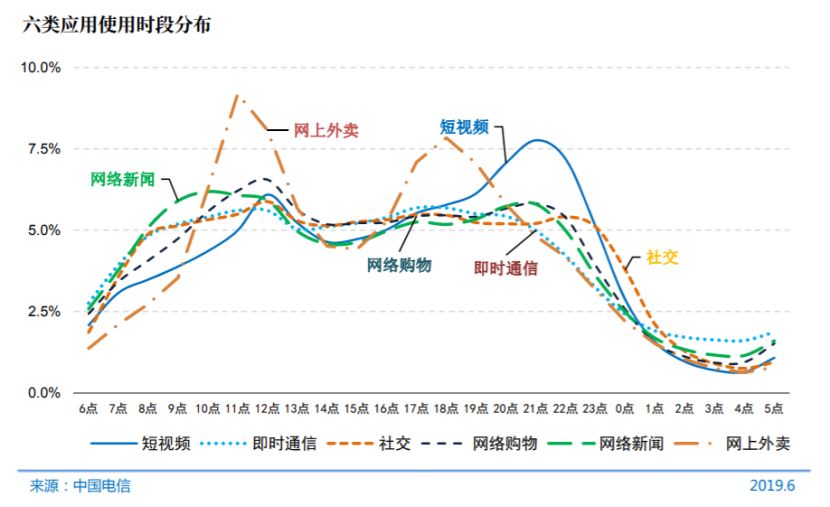 数据还显示,手机网民较常使用的六类APP中,即时通信类APP与社交类APP在9点至20点间用户使用时段分布较均匀,占比均在5%以上。