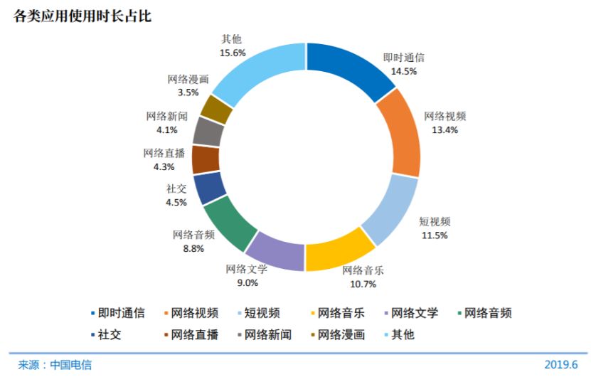 从使用时长来看,手机网民经常使用的各类APP中,使用即时通信类APP的时间最长,占比14.5%;使用网络视频、短视频、网络音乐、网络文学和网络音频类应用的时长占比分别位列二到六位,依次为13.4%、11.5%、10.7%、9.0%和8.8%。