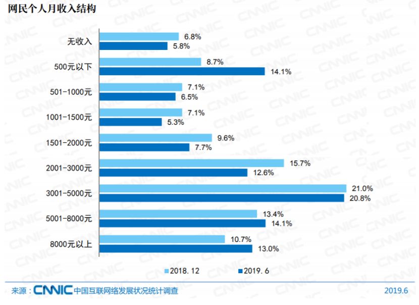 从收入结构看,无收入及月收入在500元以下的网民群体占比为19.9%;月收入在2001-5000元的网民群体合计占比超过三分之一,为33.4%;月收入在5000元以上的网民群体占比为27.2%。
