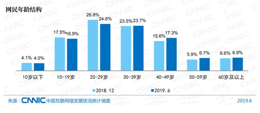 从年龄结构来看,截至2019年6月,10-39岁网民群体占网民整体的65.1%,其中20-29岁网民群体占比最高,达24.6%。