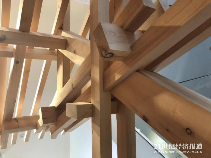 在论坛开始前,招商蛇口·设计互联馆长奥雷·伯曼为前来参与活动的观众和媒体举办了一场小型的场馆导览。他首先带大家参观了目前正在海上世界文化艺术中心展出的“榫卯”空间展。他解释道,榫卯结构源于中国传统的建筑智慧,可以让一些本无关系的物件之间产生联系,这个理念正好与海上世界文化艺术中心的场馆设计意图不谋而合。