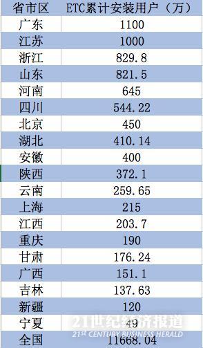 在此基础上,截至目前全国各省市的ETC安装情况如何?21世纪经济报道记者统计目前已经公布数据的19个省市区后发现,目前广东、江苏两省的ETC累计安装用户已经突破1000万,遥遥领先于其他省市区的安装情况。其次,在当前的安装工作推进进度上,沿海东部地区也要明显快于中西部地区。
