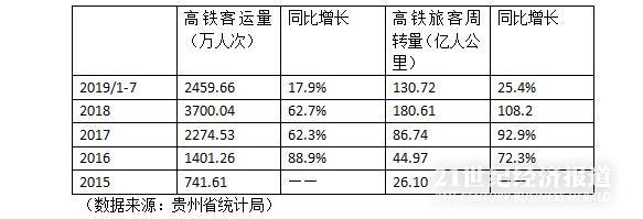 数据显示,随着贵州高铁通车里程的增加,高铁逐渐成为了贵州旅客周转和运输量最快的交通方式。以2018年的数据为例,截至年末,贵州省通过高铁实现的旅客周转和运输量增速分别为108.2%和62.7%,远高于其他交通方式。