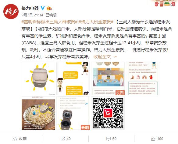 相关人士向记者发来格力电器官方微博上的文章作为回应。9月3日晚格力电器就通过官方微博发布“三高人群为什么选择糙米发芽饭”的普及长文。根据格力电器方面的解释,很多人每天吃的白米,大部分都是精制白米,它升血糖速度快。而糙米是含有丰富的维生素、矿物质和膳食纤维,糙米发芽后更是含有丰富的γ-氨基丁酸(GABA),适宜三高人群食用。但糙米发芽全过程长达17~41小时,非常复杂繁琐,不适合普通家庭日常操作。格力大松金康煲可以做到一键煮好糙米发芽饭,只需4小时。