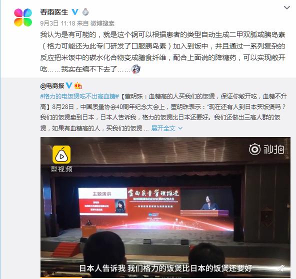 9月3日中午,春雨医生在微博上转发格力电饭煲的上述相关新闻并调侃:“我认为是有可能的,就是这个锅可以根据患者的类型自动生成二甲双胍或胰岛素(格力可能还为此专门研发了口服胰岛素)加入到饭中,并且通过一系列复杂的反应把米饭中的碳水化合物变成膳食纤维,配合上面说的降糖药,可以实现敞开吃……我实在编不下去了……”