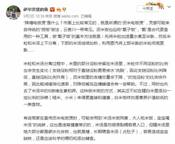微博知名科学科普博主“萨尔茨堡的魚”也转发新闻截图表示,市面上比较常见的“降糖电饭煲”是“沥米电饭煲”,做“甑子饭”的基本方法就是:先将米粒加适量水煮至半熟,然后米粒和米汤上下分离,下部的米汤继续加热,利用蒸汽将上部半熟的米粒彻底蒸熟……米粒和米汤分离过程中,米里的部分淀粉会留在米汤里,沥米饭里的含糖总量会下降,对降低餐后血糖峰值会有一些帮助。但随后“萨尔茨堡的魚”更正表示,格力的“适合三高人群”的电饭煲,和上文提到的沥米电饭煲作用原理不同。而是一款“发芽糙米”电饭煲,就是不需要提前浸泡糙米,能直接一键煮出“发芽糙米”饭的电饭煲。相对于精白米饭,这种糙米(全谷物)做出的饭相对更健康,更利于控制餐后血糖峰值,但是,同样也不可能“敞开吃,血糖不升高”。