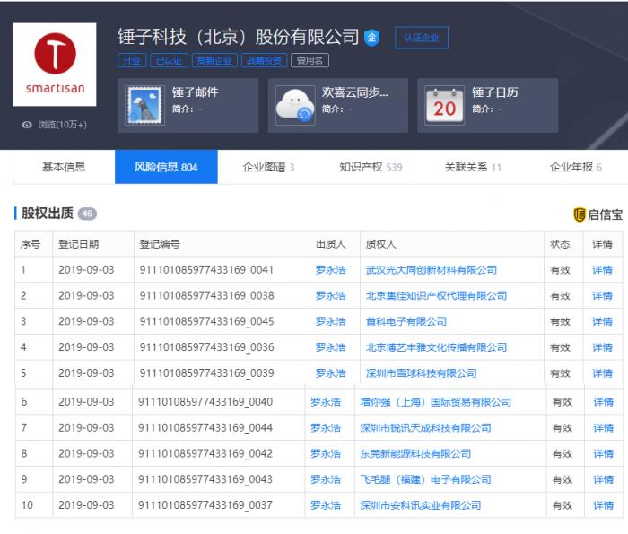 近日,锤子科技(北京)股份有限公司再度新增10条股权出质信息,出质人为罗永浩,质权人有电子科技公司、知识产权公司、文化传播公司、新能源科技公司等10家企业,其中上市公司飞毛腿(福建)电子有限公司获得3.73万元的股权,而获得腾讯、华米融资的深圳市雪球科技有限公司获得0.2万元股权。