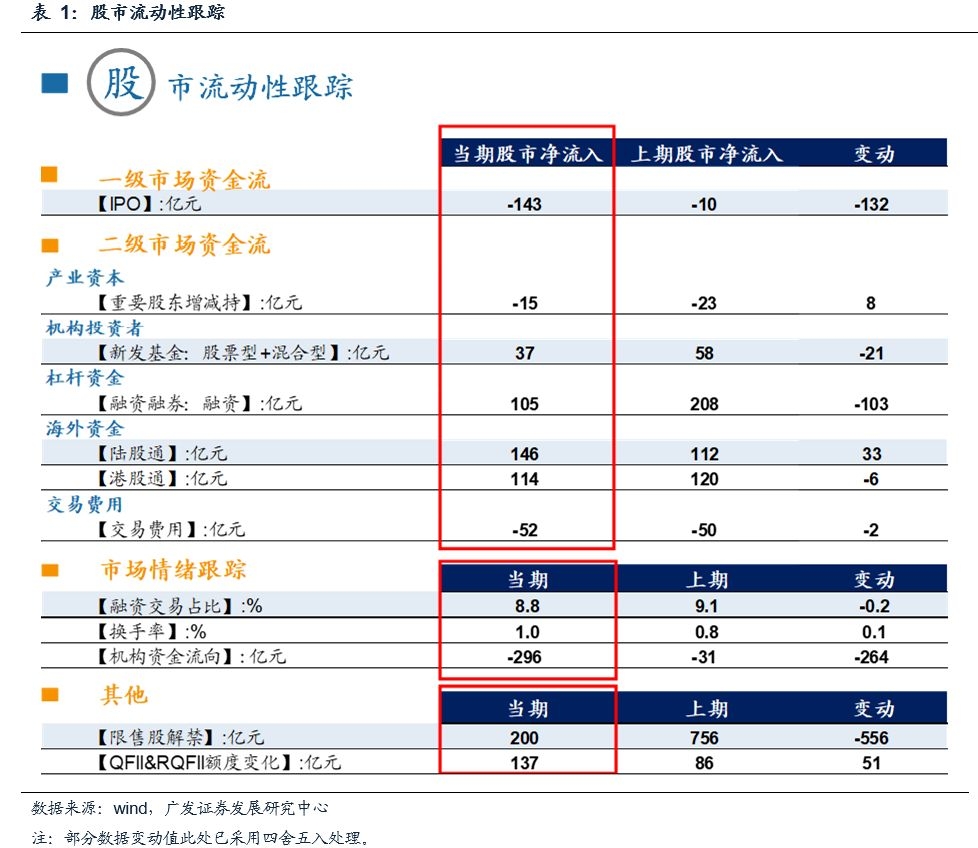 二级市场:上周受北上资金流入及两融融资余额增加影响,A股二级市场整体呈资金净流入态势。其中,资金流入方面,上周陆股通北上资金净流入146亿元,两融融资余额增加105亿元,国内新发基金(股票型+混合型)规模37亿元;资金流出方面,重要股东减持15亿元,交易费用52亿元。