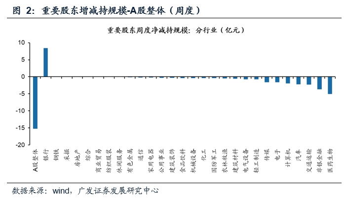 (2)重要股东增减持(A股整体):上周重要股东净减持约15亿元,前一周净减持23亿元。其中净增持行业主要有银行、钢铁;减持规模前三为医药生物、非银金融、交通运输。