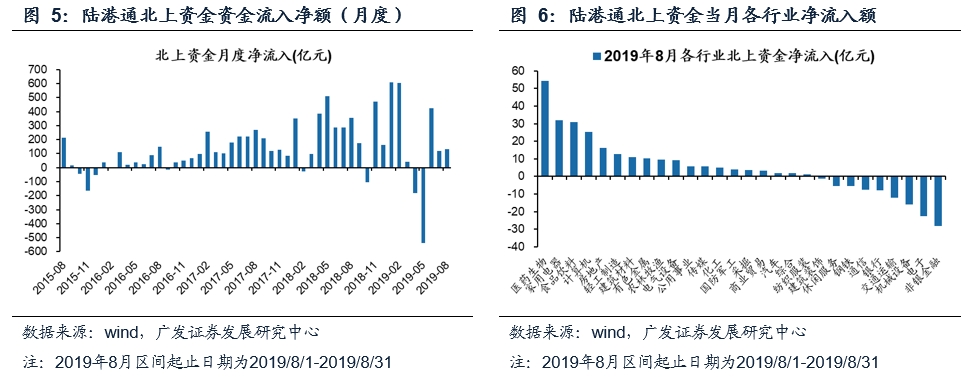 (5)陆港通北上资金流入净额:上周陆股通北上资金净流入146亿元,前一周净流入112亿元。8月北上资金净流入约132亿元。行业层面,当月北上资金流入主要集中在医药生物、家用电器、食品饮料等行业,而非银金融、电子、机械设备等行业净流出规模较大。