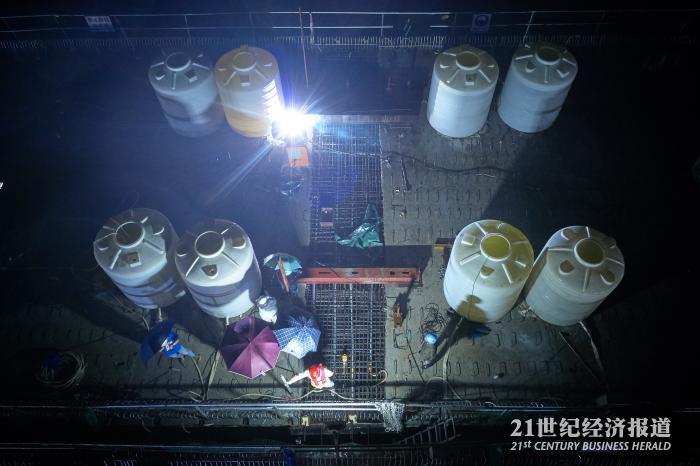9月5日凌晨零点,海陵岛特大桥项目灯火通明,水箱对称压载、体外刚性支撑梁锁定、临时预应力施加等准备工作顺利完成,现场工人开始向大桥中跨左幅合龙段浇筑混凝土……
