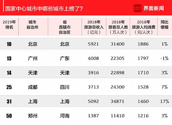旅游收入最多的城市为北京,2018年旅游总收入为5921亿元,位列第十,人均旅游消费是1886元,较去年增长1%。