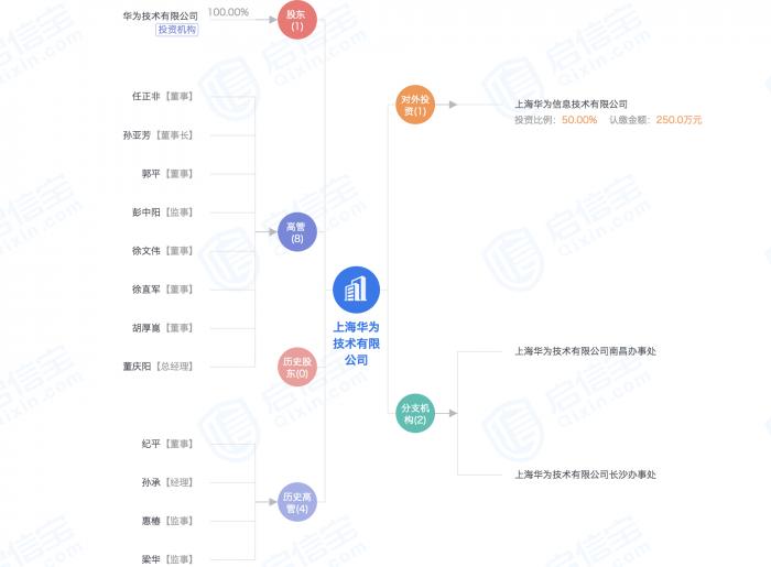 上海华为技术有限公司成立于2001年1月16日,注册资本2亿人民币,由孙亚芳人法定代表人兼董事长,任正非为公司董事,华为投资控股有限公司工会委员会持股98.99%。其经营范围包括,软件开发,通信技术领域内的技术服务,程控交换机、传输设备等。