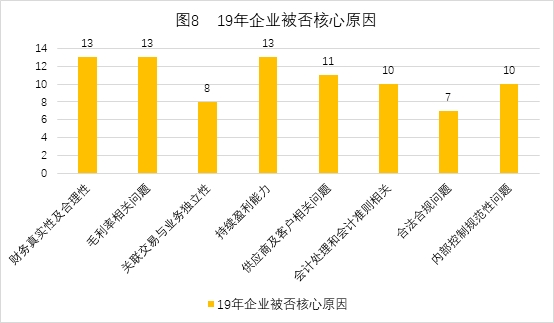 从2019年被否企业问题及审核结果情况来看,发审委关注重点仍集中在:财务真实性及合理性、毛利率相关问题、关联交易和业务独立性质疑、持续盈利能力、供应商&客户相关问题、合法合规问题、内部控制规范性问题、会计处理和会计准则相关。