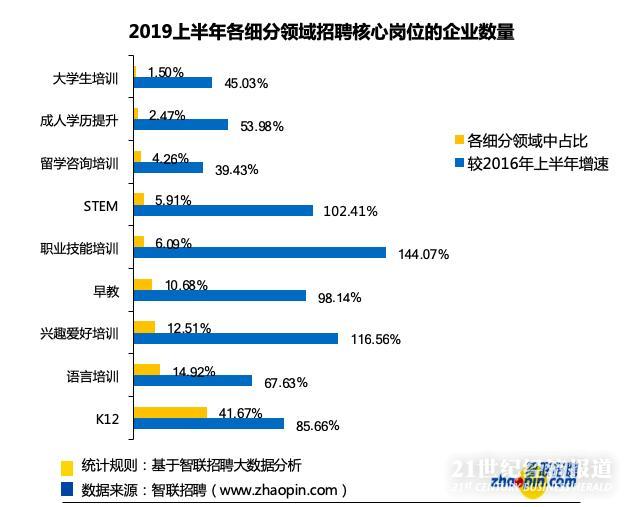 除K12外,语言培训、兴趣爱好培训和早教领域规模也较大,招聘机构占比均在10%以上;职业技能培训、兴趣爱好培训、STEM(面向青少年的科学、技术、工程和数学教育)等领域在2019年上半年的招聘企业数量较2016年上半年均增长了一倍多,是发展较快的领域。