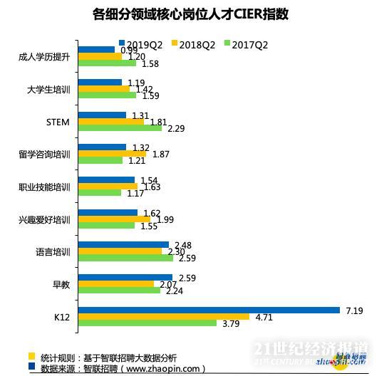 K12领域的CIER指数(中国就业市场景气指数)最高,且从2017年二季度至2019年二季度持续大幅上涨,2019年二季度达到7.19,意味着每7.19个工作岗位仅有1人投递,人才缺口巨大。