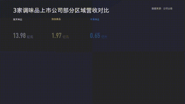 2018年,海天味业在西部地区的收入为17.17亿元,是公司区域营收榜上最低的一部分,但已经足够“秒杀”其他同行。对比之下,四川本地调味品上市企业千禾味业在西南地区收入为5.69亿元,加上西北地区也不到5.96亿元;中炬高新中西部区域合计收入6.3亿元;加加食品西南、西北区域合计3.94亿元。而在其他区域上,3家企业的总和也难敌海天味业。