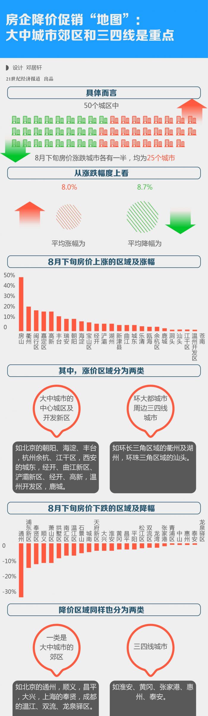 具体而言,50个城区中,8月下旬房价涨跌城市各有一半,均为25个城市。从涨跌幅度上看,平均涨幅为8.0%,平均降幅为8.7%。