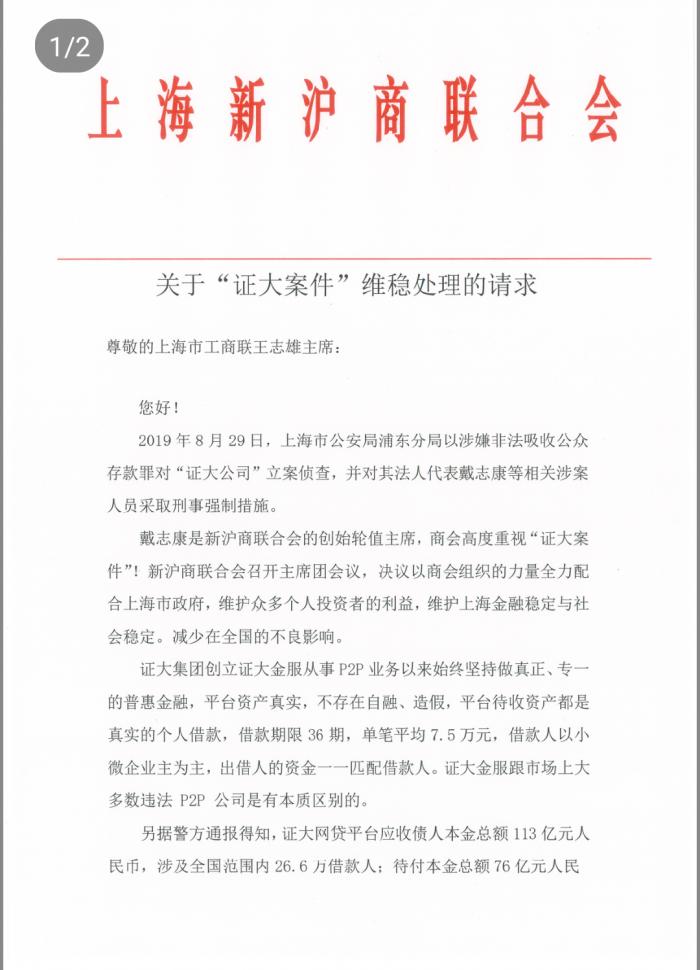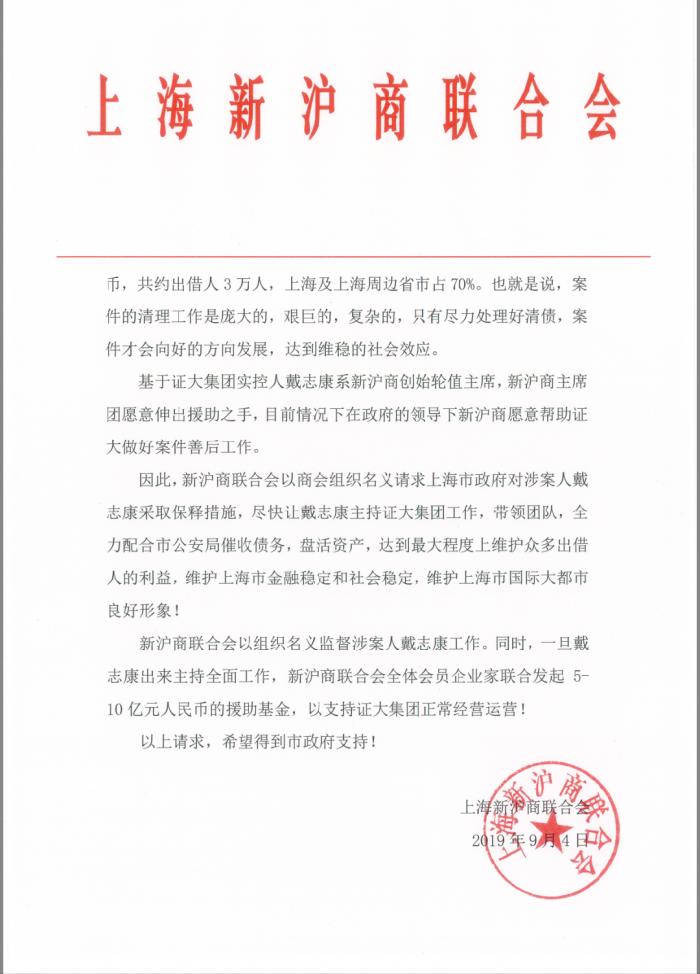 这份文件提到,基于证大集团实控人戴志康系新沪商创始轮值主席,新沪商主席团愿意伸出援助之手,在政府的领导下,新沪商愿意帮助证大做好案件善后工作。