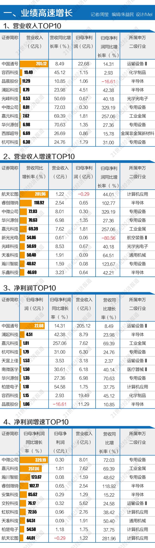 其中,航天宏图、睿创微纳营收增长超过一倍以上,分别为282%、119%;嘉元科技、瀚川智能、睿创微纳净利润实现翻番,分别为257%、124%和103%;中微公司实现净利润3037万元,扭亏为盈。
