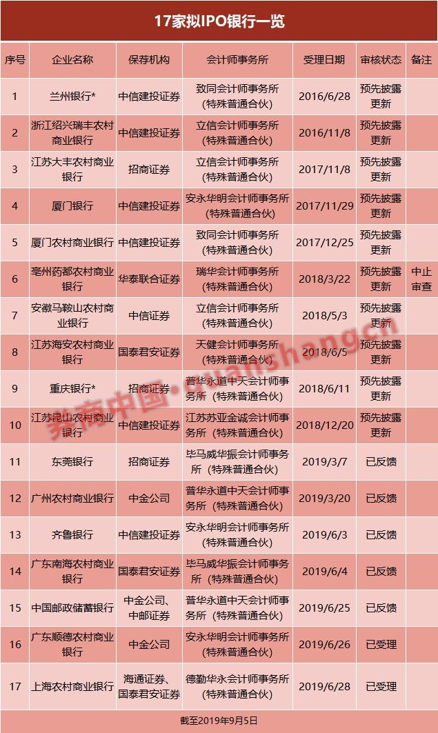 截至9月5日证监会最新数据,除了已经过会的银行,A股排队银行还多达17家,有10家已经处于“预先披露更新”审核状态,5家银行属于“已反馈”状态,2家银行属于“已受理”状态。