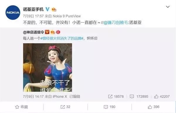 今年7月,一位博主与网友互动:每人说一个曾经很火但消失了的品牌,有网友提到了诺基亚。