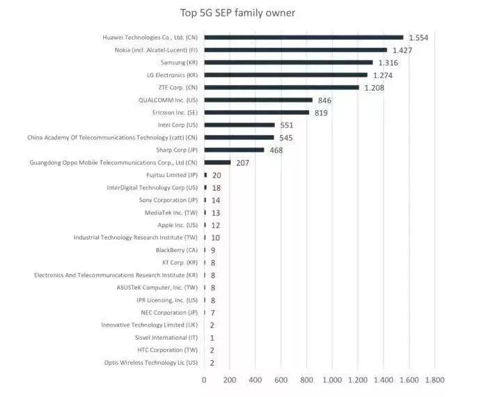 诺基亚在过去十多年占据手机行业产业链上游,多年来诺基亚积累了大量的通信技术专利。专利数据公司IPlytics发布的《5G专利报告数据》中显示,华为以15.05%的5G SEP专利占比排名第一,而中国企业总共占比34%。诺基亚以14%的占比排名第二,而爱立信则以8%排名第七。