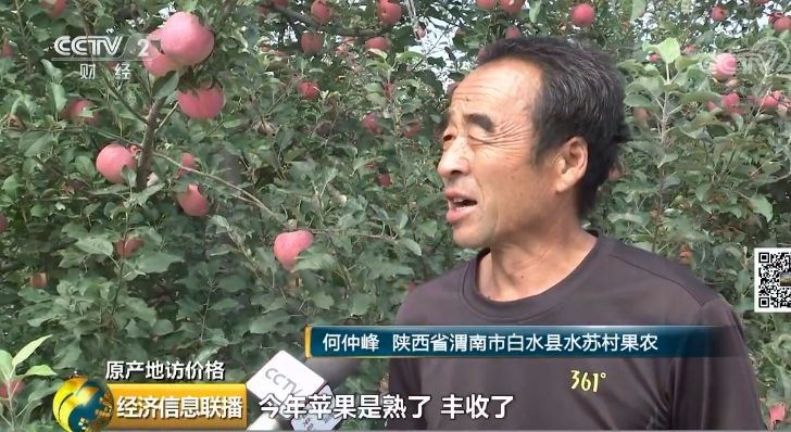 陕西省渭南市白水县水苏村果农 何仲峰:今年苹果是熟了,丰收了。按照今年气候这种情况,今年产量还可以,去年因为灾害没有产量。