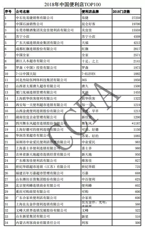 根据2018年中国便利店TOP100榜单,中石化易捷便利店门店数以27259的成绩位居榜首,遥遥领先。