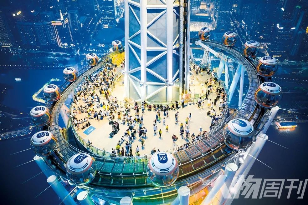 广州,游客在广州塔上乘坐摩天轮,观赏夜景