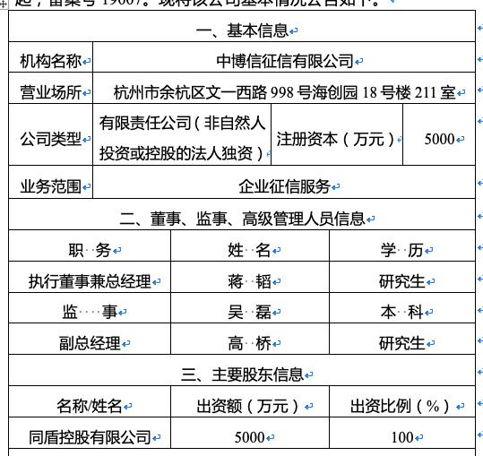 公告显示,根据有关规定,中国人民银行杭州中心支行于2019年4月26日起,对受理中博信征信有限公司企业征信机构备案申请事项进行公示,公示期间无异议,现决定予以备案,而中博信征信系同盾控股全资子公司,同盾科技CEO蒋韬担任中博信征信执行董事兼总经理。