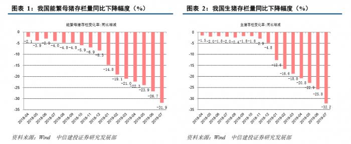 根据中信建投证券8月30日发布的农林牧渔行业报告,2018年8月我国发生非洲猪瘟疫情以来,疫情致死、扑杀、补栏信心低迷等因素叠加影响下,我国能繁母猪存栏量下滑逐月加快,截至2019年7月末,我国能繁母猪存栏2165万头,同比下降 31.9%。
