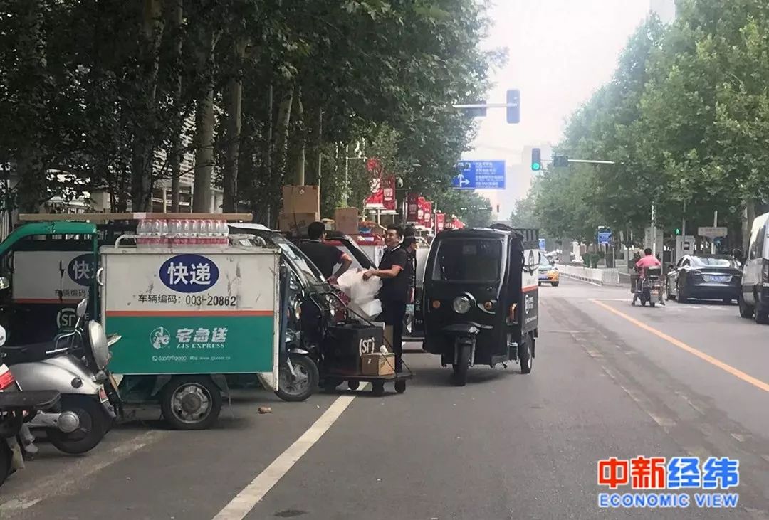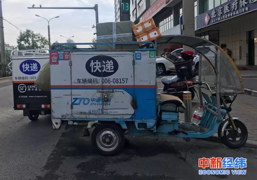 中新经纬了解到,目前快递员使用的三轮车,除顺丰快递由公司配备,其余多为快递员自行购买,再贴上相应统一的快递公司外包装贴纸。