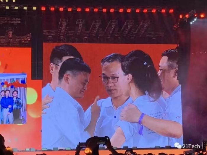 演讲完毕后,与他曾经一同创业的阿里巴巴十八罗汉中的五名代表,突然出现在舞台上,老朋友相见,同时回望舞台上那张二十年前在长城的合影时,感慨不已。
