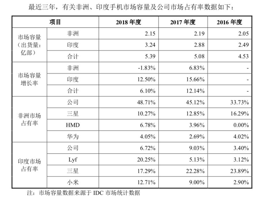 之所以被称为“非洲之王”,是因为传音控股在非洲市场远高于其他手机厂商的市场占有率和品牌影响力。据其招股说明书,2018年公司手机出货量1.24亿部,根据IDC统计全球市场占有率达7.04%,在全球手机品牌厂商中排名第四;非洲市场占有率高达48.71%,排名第一;印度市场占有率达6.72%,排名第四。