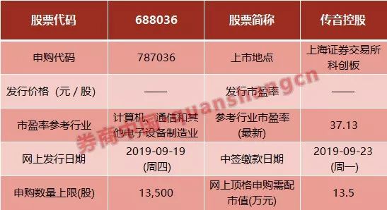 具体来看,传音控股申购代码为787036,申购限额为1.35万股,顶格申购需13.5万市值。