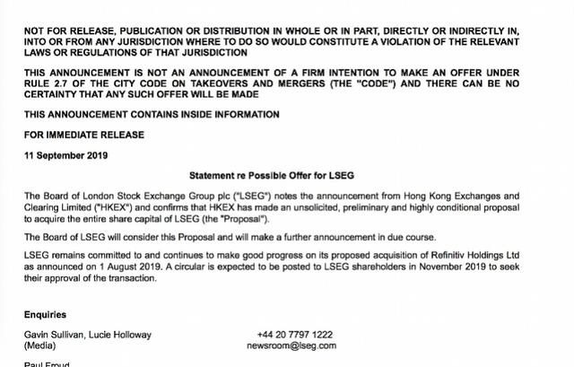The Board of London Stock Exchange Group plc ("LSEG") notes the announcement from Hong Kong Exchanges and Clearing Limited ("HKEX") and confirms that HKEX has made an unsolicited, preliminary and highly conditional proposal to acquire the entire share capital of LSEG (the "Proposal").