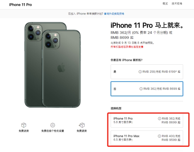 随后,苹果中国官网也更新了售价,显示iPhone 11国行版起售价5499元,iPhone 11 Pro、iPhone 11 Pro Max售价分别为8699元起、9599元起,9月13日接受预定,9月20日开启全球发货。