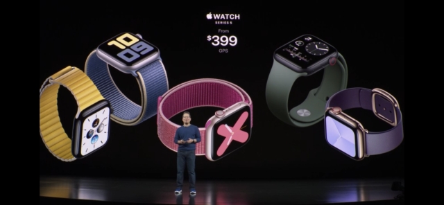 Apple Watch方面,今年苹果带来新一代Apple Watch 5,有陶瓷表壳、钛合金表壳、铝质表壳、不锈钢版四种材质,以及陶瓷白、黑、金、银、深空灰等五种配色,还在表盘内加入了指南针。界面方面,Apple Watch 5也做出了优化,比如支持“屏幕常亮”功能,可抬腕调解屏幕亮度以查看时间。起售价399美元(约合人民币2838元),蜂窝板499美元(约合人民币3549元),国行版3199元起,将于即日起开售,9月20日开始在线下店面销售。