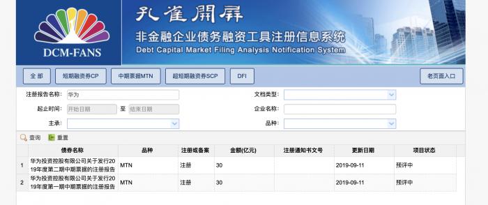 中国银行间市场交易商协会“孔雀开屏”系统显示,华为投资控股有限公司正在申请注册200亿元中期票据额度;9月11日,华为第一、二期中期票据已进入“预评”状态,总额度为60亿元。