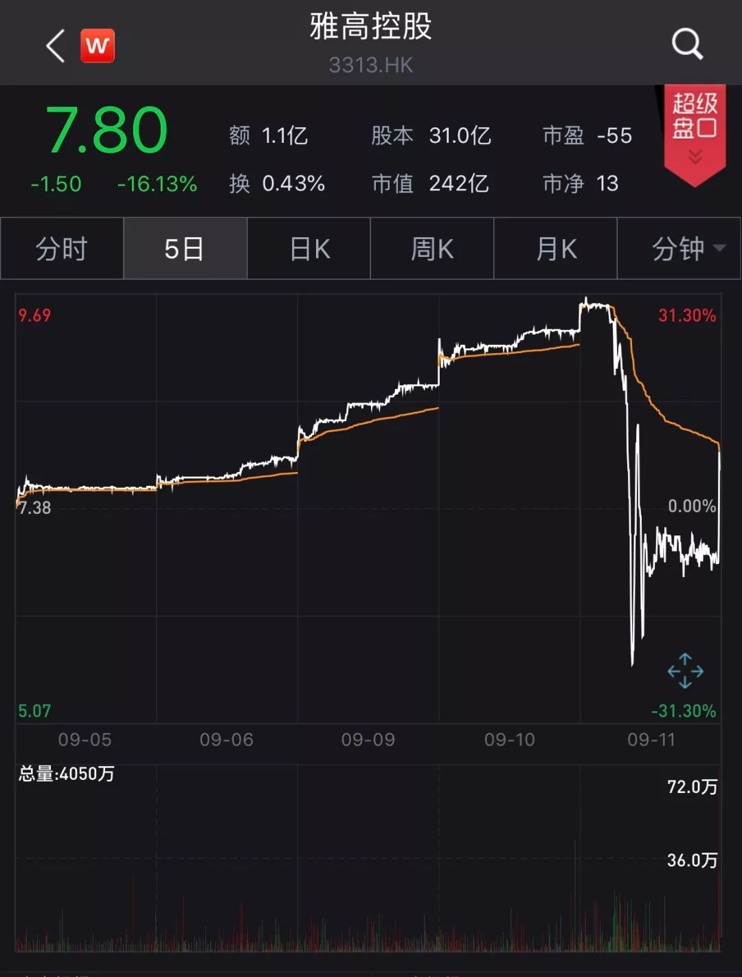 不过“只涨不跌”的神话今天破灭了。9月11日早盘,雅高控股创下历史新高,11:30前后突然跳水,一度暴跌近40%。午盘跌幅收窄,截至收盘跌幅约16%,全天成交额1.1亿港元。