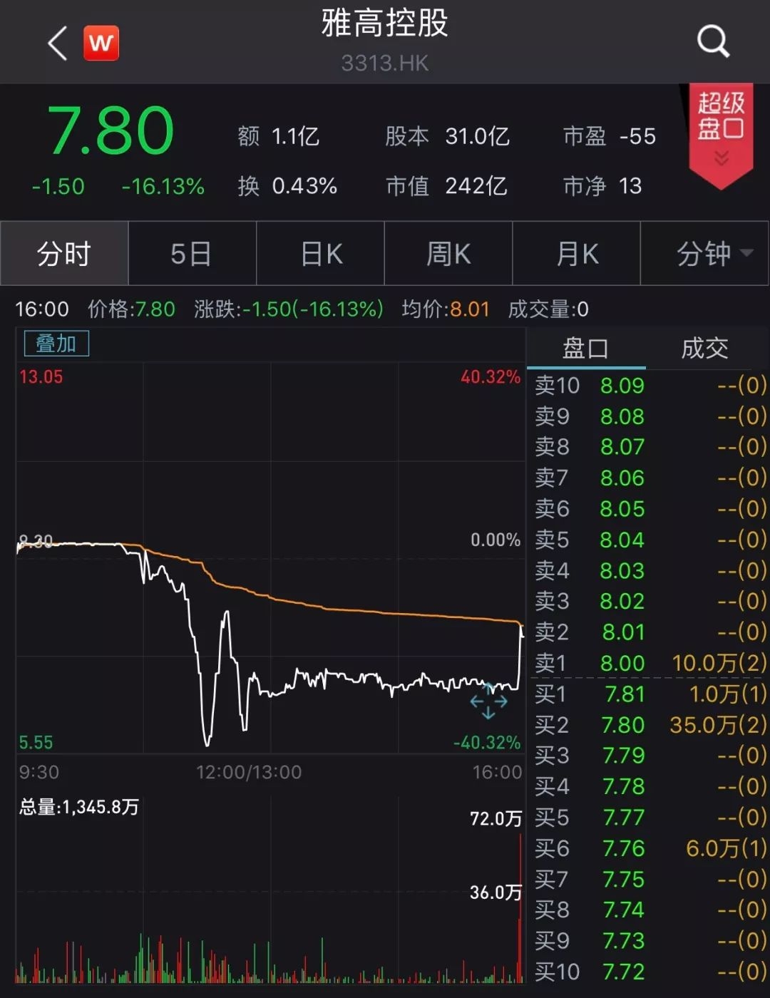 9月11日,雅高控股的股价从开盘的9.4港元至收盘变为7.8港元,盘中股价一度跌近40%,后跌幅收窄,至收盘跌16.13%。