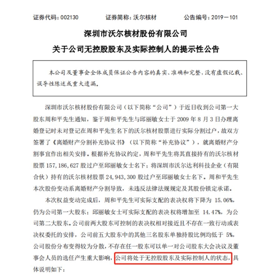 彼时办理离婚登记的时点,距离沃尔核材2007年上市仅两年时间。离婚时,二人未对登记在周和平名下的沃尔核材股票进行实际分割过户,因此双方签署了《离婚财产分割补充协议书》。