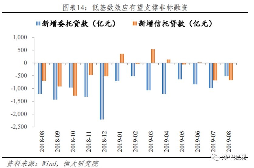 2)表外融资:表外融资有望成为社融增速重要支撑,但房地产信托收紧抑制信托融资,预计表外融资持平或略强于去年同期。非标融资是新增社融波动的主要来源之一。受资管新规影响,2018年3月起非标融资大幅萎缩,2018年9-12月新增委托贷款减少1000-2500亿元/月,新增信托贷款减少500-1500亿元/元。2019年信托贷款有所回暖,委托贷款压降减小,宽信用叠加低基数有望支撑社融增速。不过2019年7月以来的房地产信托监管趋严,新增信托贷款可能重回负增长,但预计不会弱于去年同期。