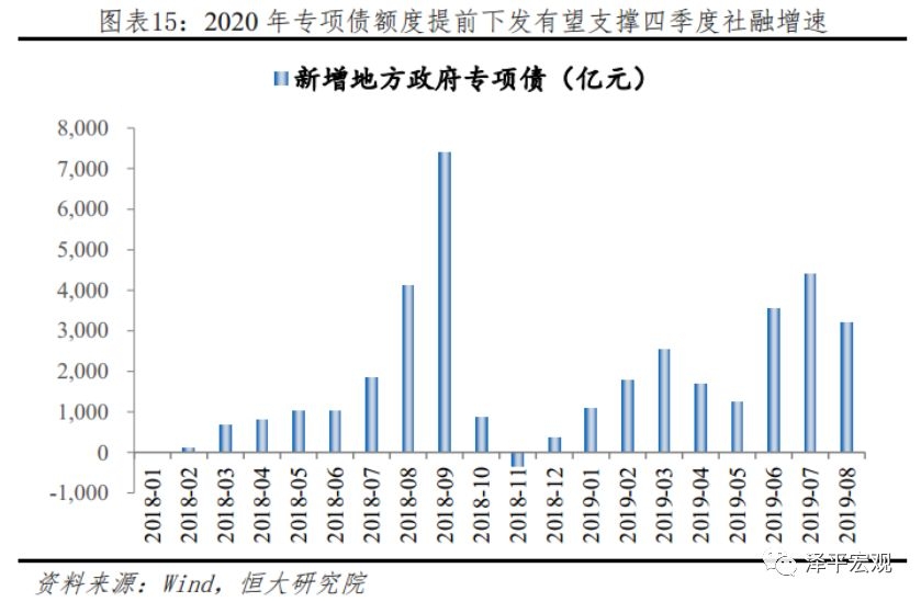 3)地方专项债:9月新增地方政府专项债萎缩将使社融承压,2020年专项债额度“提前下发”是四季度社融增速的支撑因素。2019年1-7月地方政府专项债发力有效支撑社融增速,但随着2019年地方债发行额度耗尽,社融增长动力不足。9月新增专项债发行额度仅2000亿元,去年同期高达7389亿元,少增近5300亿元。不过9月4日国常会将提升专项债额度作为积极财政的选项,明确提前下发明年专项债的部分新增额度,四季度专项债发行或将重新提速。去年四季度合计新增专项债规模不足900亿元,新增专项债额度将成为四季度社融增速的重要支撑。