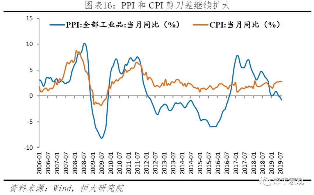 PPI受内外需不振,将持续下行,压制企业利润和制造业投资。外需方面,全球经济下行和中美贸易摩擦升级拖累出口,进而沿产业链影响PPI。内需方面,融资、销售、土地购置、新开工等先行指标下行,房地产投资下行;部分新增专项债额度虽已提前下达,但新增额度有限,拉动基建的幅度预计有限。
