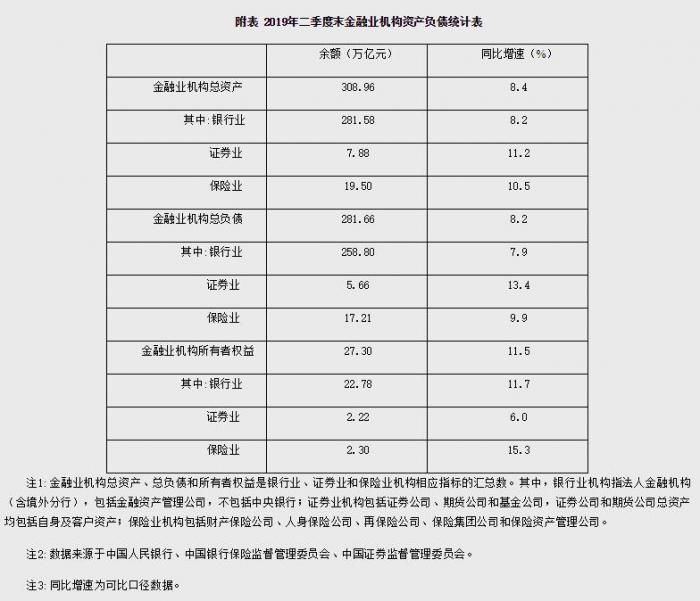 央行数据显示,初步统计,2019年二季度末,我国金融业机构总资产为308.96万亿元,同比增长8.4%,其中,银行业机构总资产为281.58万亿元,同比增长8.2%;证券业机构总资产为7.88万亿元,同比增长11.2%;保险业机构总资产为19.5万亿元,同比增长10.5%。