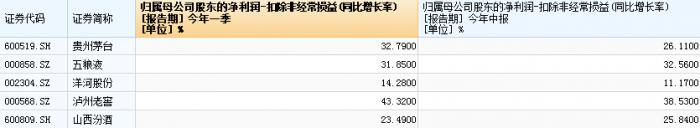 茅五洋,外加泸州老窖,4家头部酒企中,仅有洋河股份一家中报增速同比提升。环比看,贵州茅台单季度利润增速结束三个季度连续提升,今年二季度开始下降,环比降22.21%。