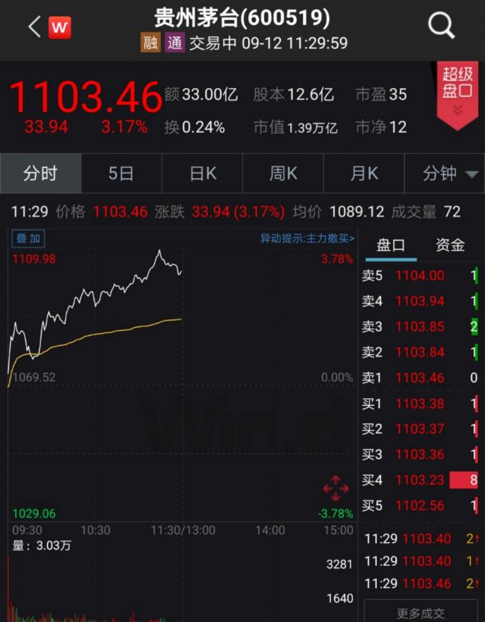 9月11日大跌后,12日早盘贵州茅台反弹超过3%,但是仍未能收付昨日失地……